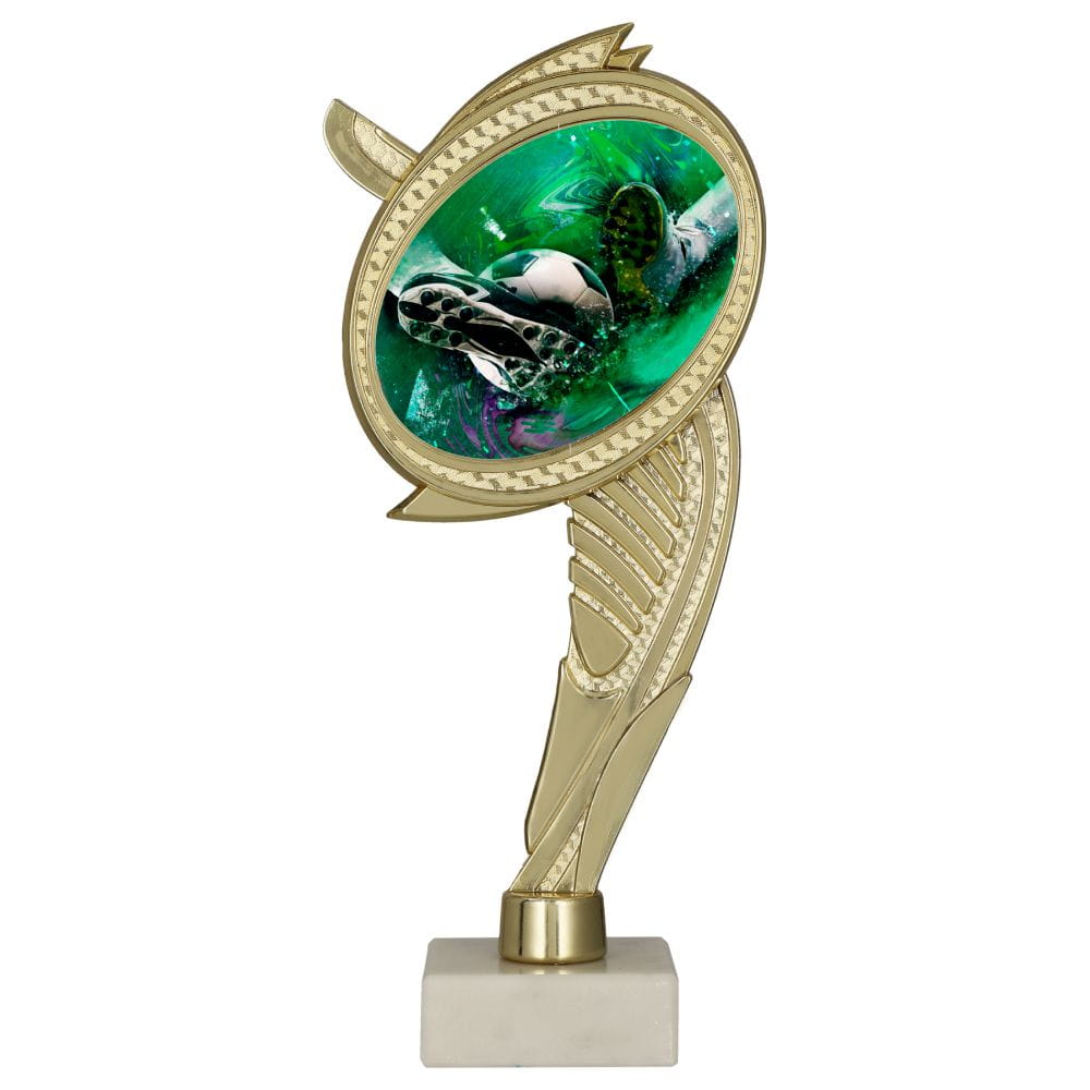 Nasza statuetka sportowa to precyzyjny puchar plastikowy piłkarski o strukturze imitującej szlachetne złoto. Wykorzystanie trwałych materiałów gwarantuje odporność na uszkodzenia, a precyzyjnie odwzorowane detale butów piłkarskich i piłki nadają jej luksusowy wygląd. Całość osadzona jest na solidnej i stabilnej podstawie z tworzywa sztucznego, przygotowanej pod profesjonalny grawer.