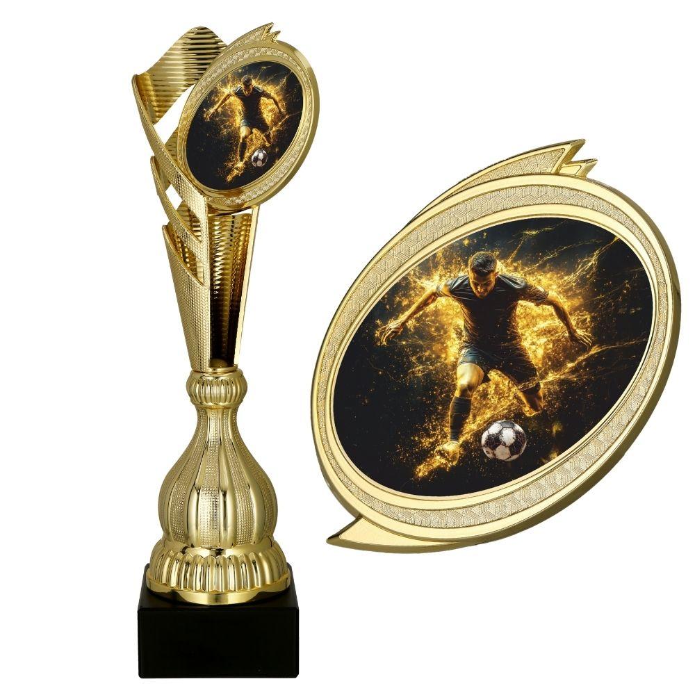 Design: Nowoczesny design sportowy z wyraźnym motywem piłkarskim. Złota czasza o unikalnym kształcie przyciąga wzrok, a elegancka kompozycja sprawia, że puchar pasuje do każdej gabloty.