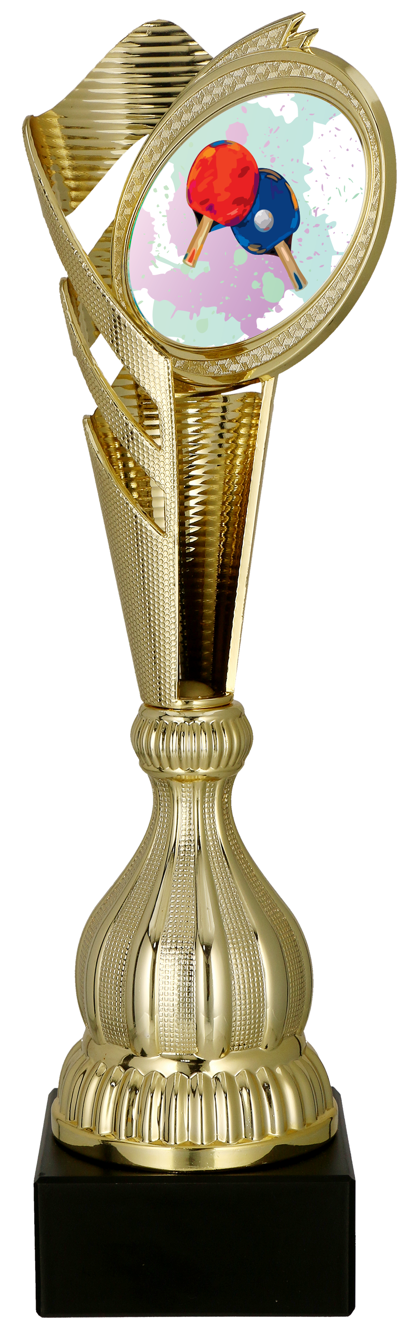 Nowoczesny puchar z tenisa stołowego o nowoczesnym wyglądzie z plastikową tarczą rakietek tenisowych na marmurowej podstawie. Produkt marki Tryumf ™. Idealnie pasuje na nagrody w zawodach tenisa stołowego, czy indywidualnych nagród. Kielich w kolorystyce złotej. Puchar robi duże wrażenie. Dla odbiorców, którzy cenią elegancje i styl.