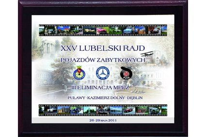 Dyplom drewniany grawerowany na drewnianym podkładzie oraz aluminiowej blaszce, która może być w kolorze złotym, srebrnym lub białym.