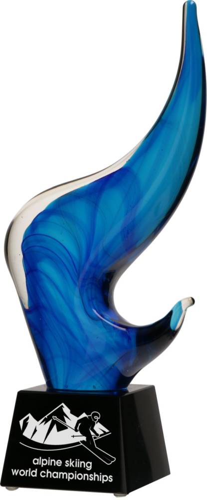Nowoczesne szklane trofeum o wysokości 27 cm, barwione o niebieskim odcieniu podkreśla jego elegancję i styl.